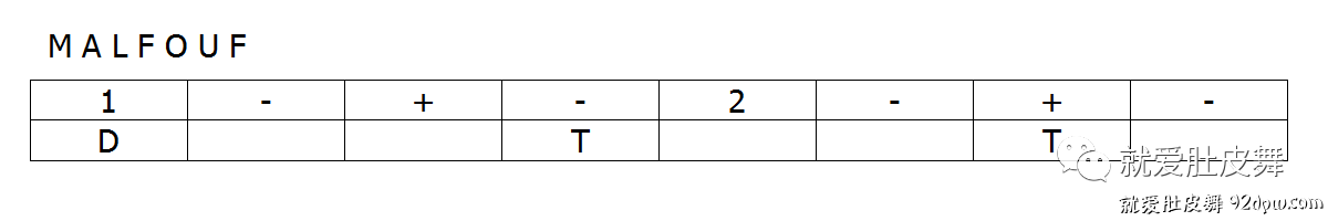 Malfouf在阿拉伯语里是翻滚/滚动的意思,在这个节奏里,只有第一正拍里有一个低音Doum,其余的都是高音。而这个低音与两个Tek所在的点位感觉把2拍切分成了3段均匀的时长,乍听之下有点类似3拍子的节奏。而把Malfouf连贯起来唱念会发现,就像它的名字一样,轻松活泼,弹性十足,一直滚动地向前推进,丝毫没有停下来的意味。