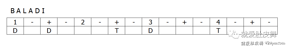 相信大家在了解肚皮舞风格时都听过一种叫Baladi的舞蹈类型,但Baladi节奏和Baladi风格有联系又有所区别,Baladi风格的乐曲一般都会用到Baladi节奏,但它并不是这类风格的专属品, Baladi风格里也会用到其它的节奏型,而任何阿拉伯乐曲中都可以用到Baladi节奏。Baladi在阿拉伯语里是祖国的意思,而它运用之广泛似乎也在暗示其“国民节奏”的地位。它由Maqsoum节奏演变而来,所以点位和Maqsoum相同,唯一不同的是第一个高音Tek换成了低音Doum,与Maqsoum相比,给人从一开始就直奔主题,庄重而不虚张声势的感觉。