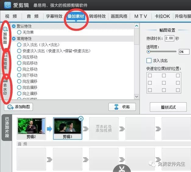 爱剪辑的“叠加素材”功能分为三栏:“加贴图”、“加相框”、“去水印”。我们可以根据自己的爱好进行添加创作。