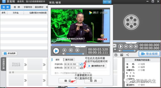2.添加视频进入“预览/截取”对话框后,在该对话框截取视频片段。如果不需要截取视频片段,那我们可以直接点击“确定”按钮,将视频导入“爱剪辑”。