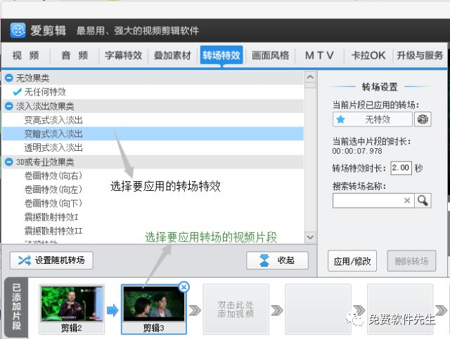 在“已添加片段”列表,选中要应用转场特效的视频片段缩略图,在“转场特效”面板的特效列表中,选中要应用的转场特效,然后点击“应用/修改”按钮即可。