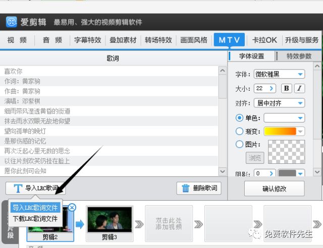 如果剪辑的是一个MV视频,我们还需要为视频添加MTV字幕或卡拉OK字幕。在爱剪辑中,我们只需要一键导入音乐匹配的LRC歌词文件或KSC歌词文件即可。