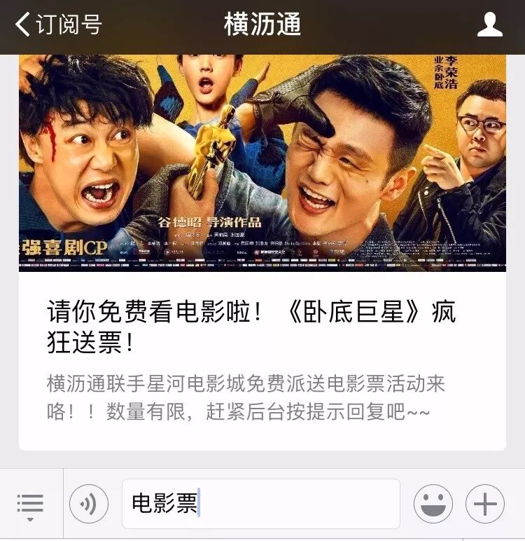 即日起,关注横沥通,在横沥通后台回复“电影票”,按提示操作,即有机会获得星河电影城免费观看影片《卧底巨星》,共7个名额,每个名额2张票!1月11日晚上8点抽出中奖粉丝哦~中奖的粉丝可观看《卧底巨星》任意场次!有效期为1月12-1月14日。