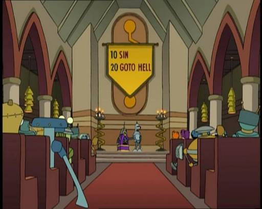 《飞出个未来》(Futurama)中机器人宗教教堂挂着的 Basic 教义
