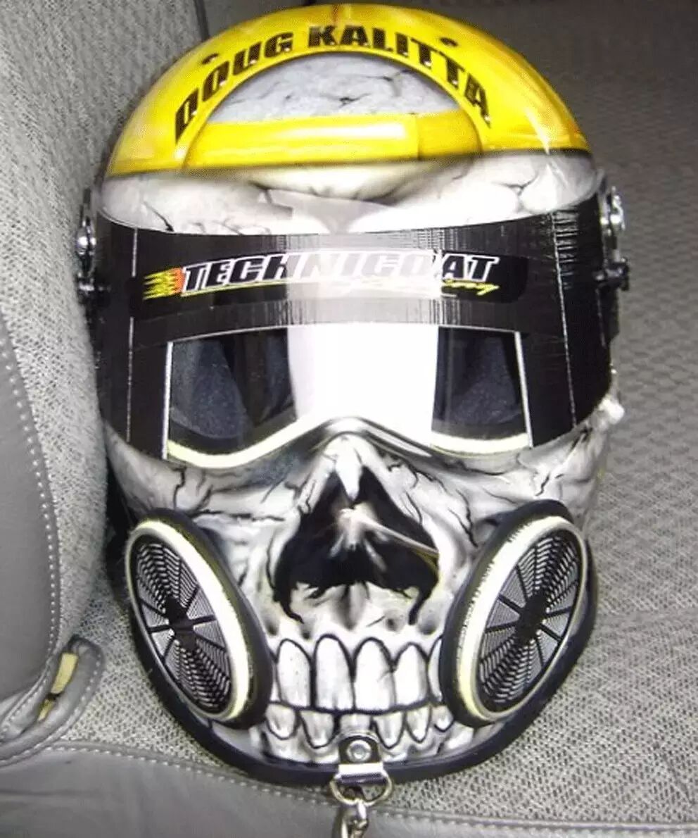 ▲头盔上、防护服上,都有著名的独立机车品牌West Coast Choppers的LOGO