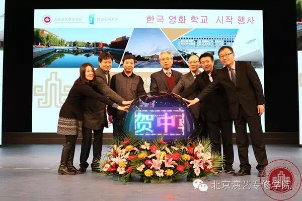 11月24日,演艺专修学院中韩影视学院揭牌仪式在北演剧场隆重举办。揭牌仪式由副院长刘国臻主持。韩国全州大学副校长崔源喆、国际交流院院长高仙祐、表演娱乐专业主任金正秀、国际交流院副主任李秀珍、中国事务所所长宋荣大,演艺专修学院院长徐进才,党支部书记、常务副院长、中韩影视学院院长陈强、副院长宫丽现场为中韩影视学院揭牌。中韩影视学院全体学生也参加了揭牌仪式。